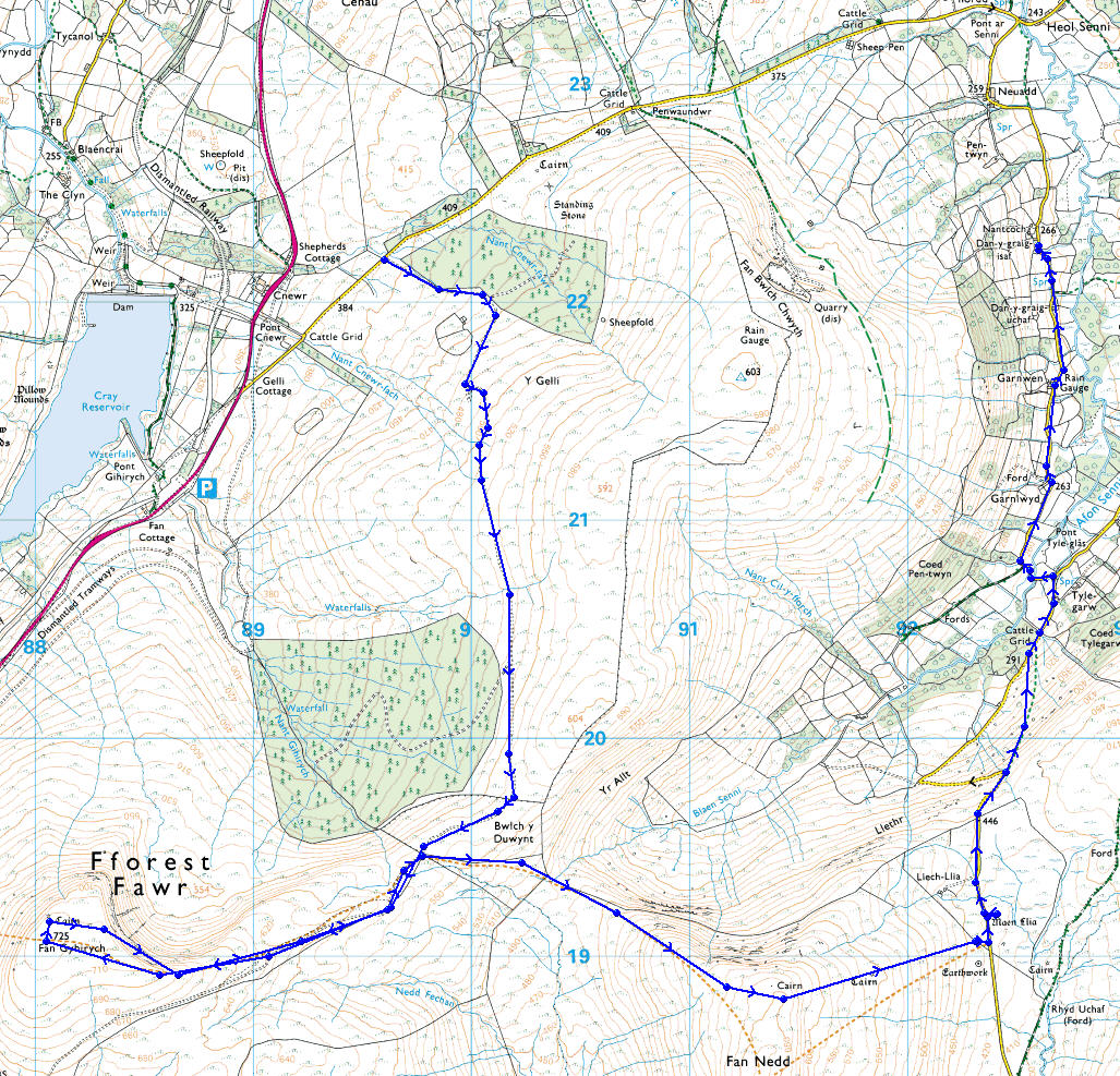 This walk is on paths and moorland with fine views to the north and south. It shows the route taken in September 2004.